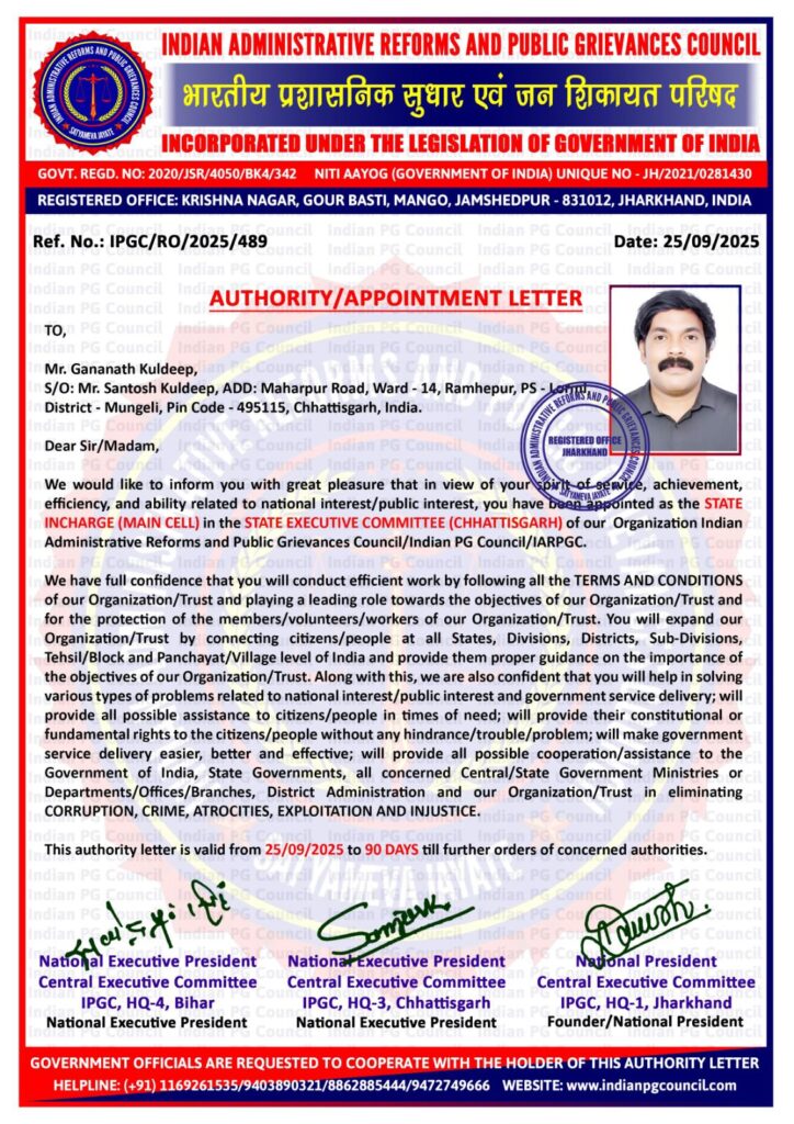 शिकायत लोरमी के गणनाथ कुलदीप को भारतीय प्रशासनिक सुधारना एवं सार्वजनिक शिकायत निवारण परिषद ( मुख्य प्रकोष्ठ ) में प्रदेश प्रभारी नियुक्त किया गया